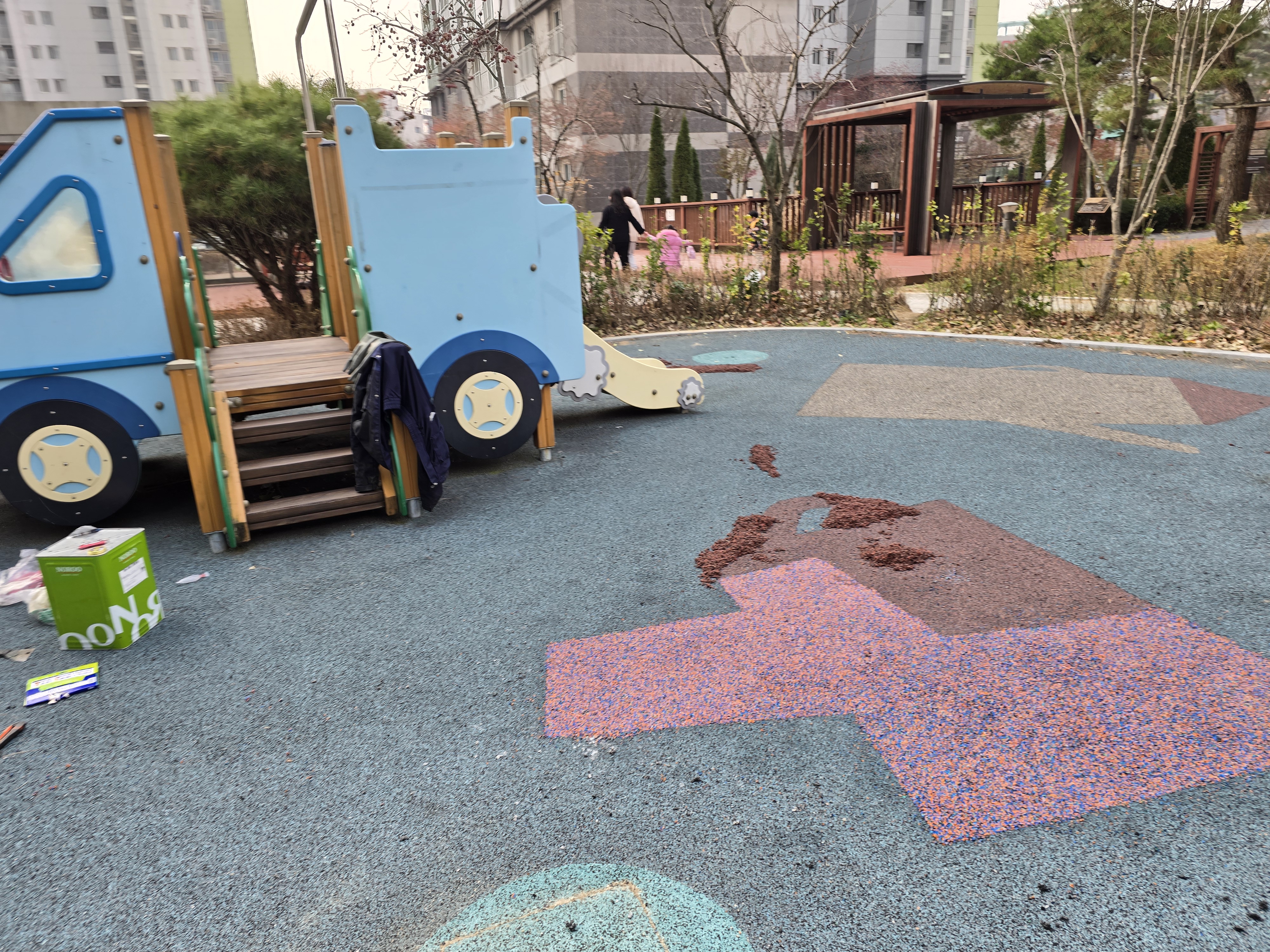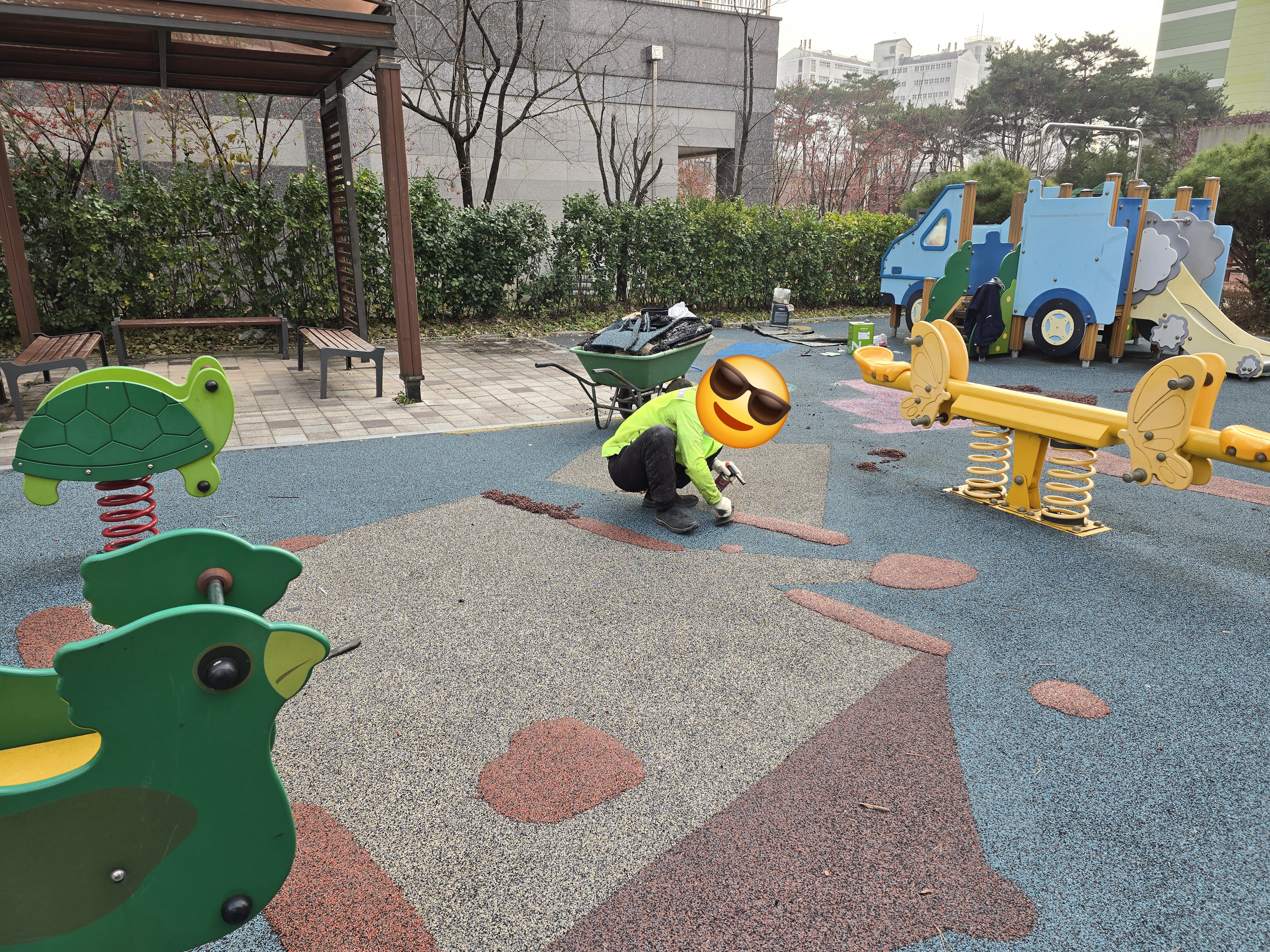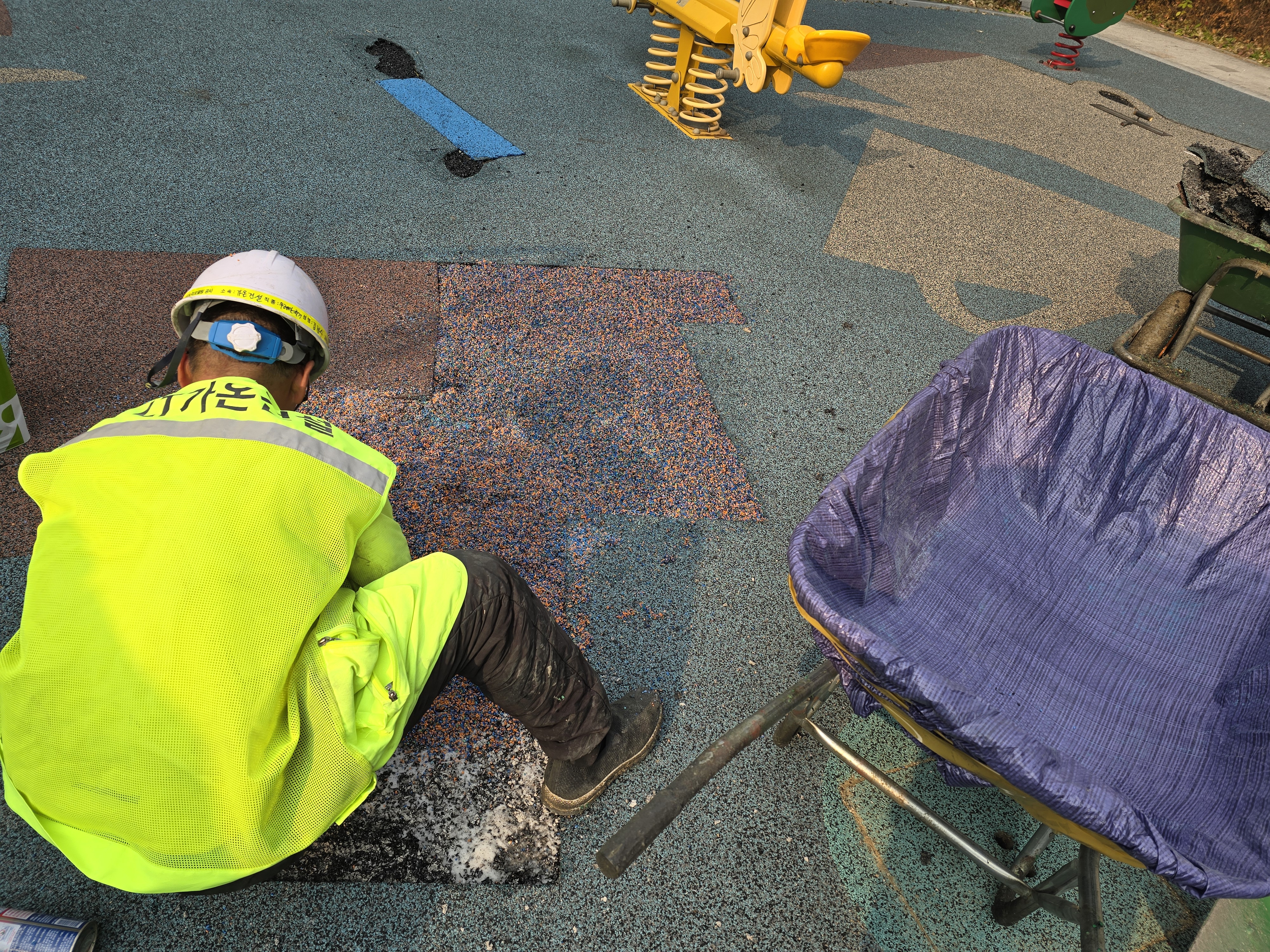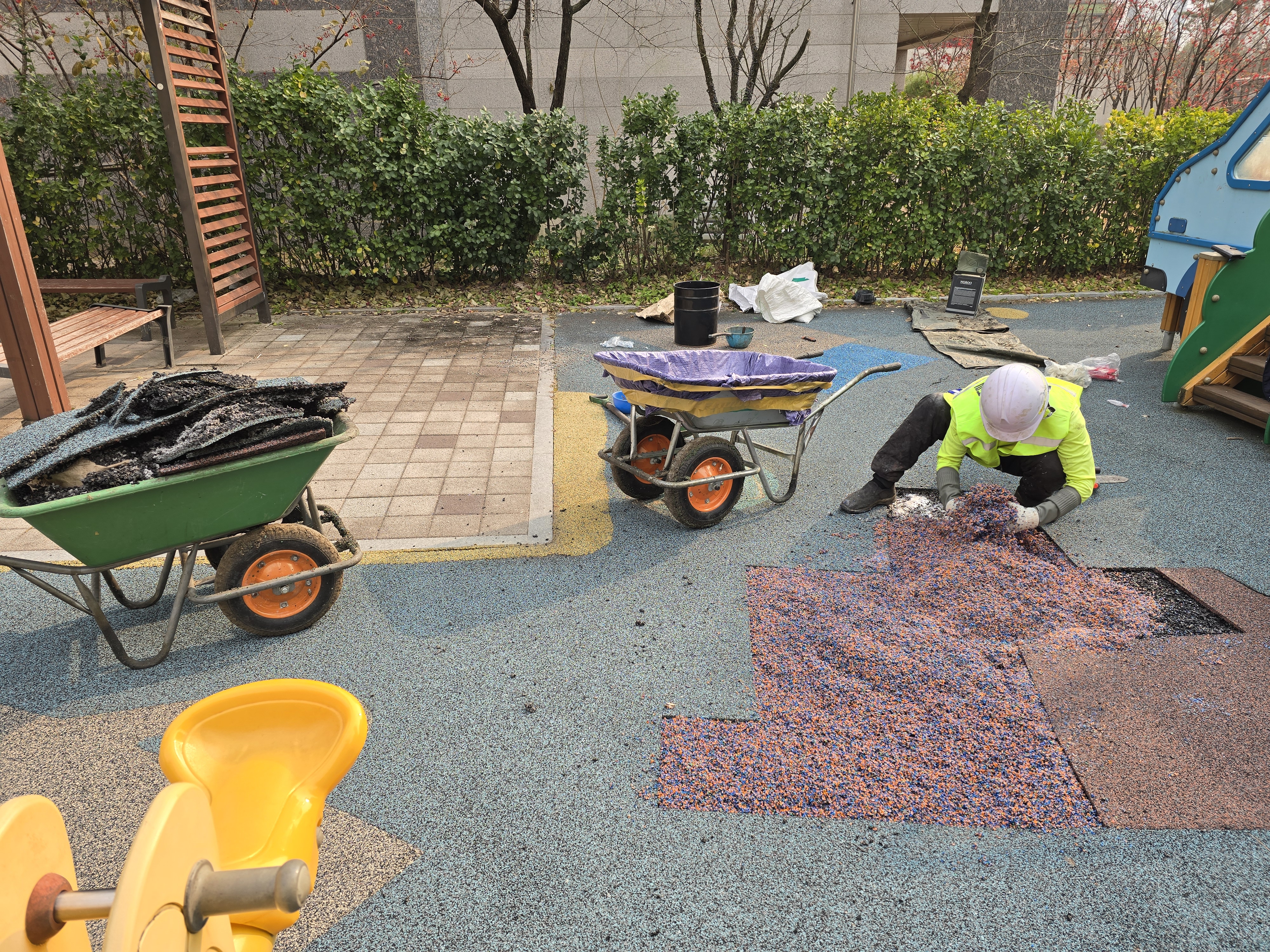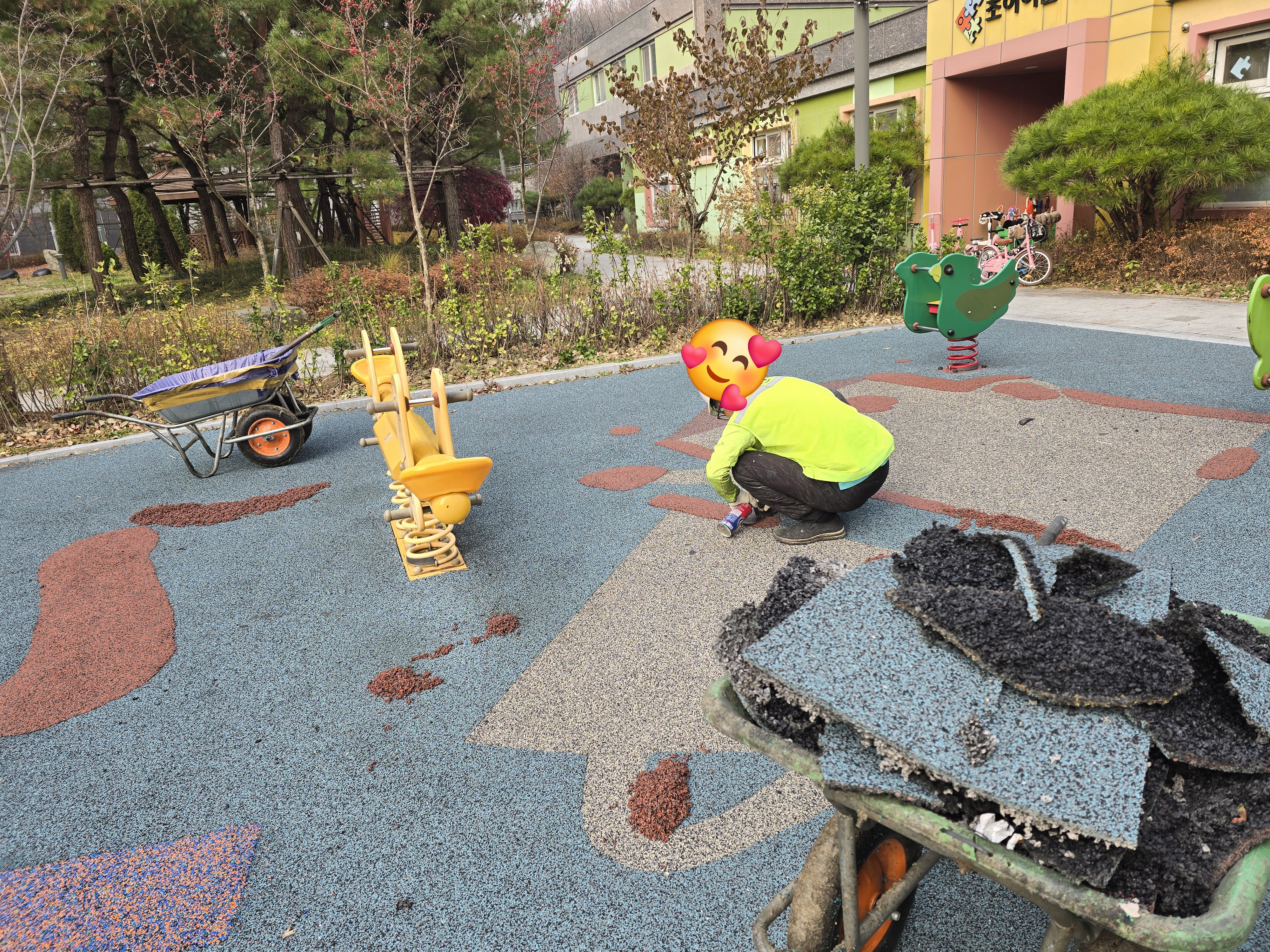 오늘은 민락동 ㅇㅇ아파트 단지내 어린이놀이터 바닥 훼손으로 인한 부분 친환경 탄성고무칩 보수 작업을 진행했습니다.