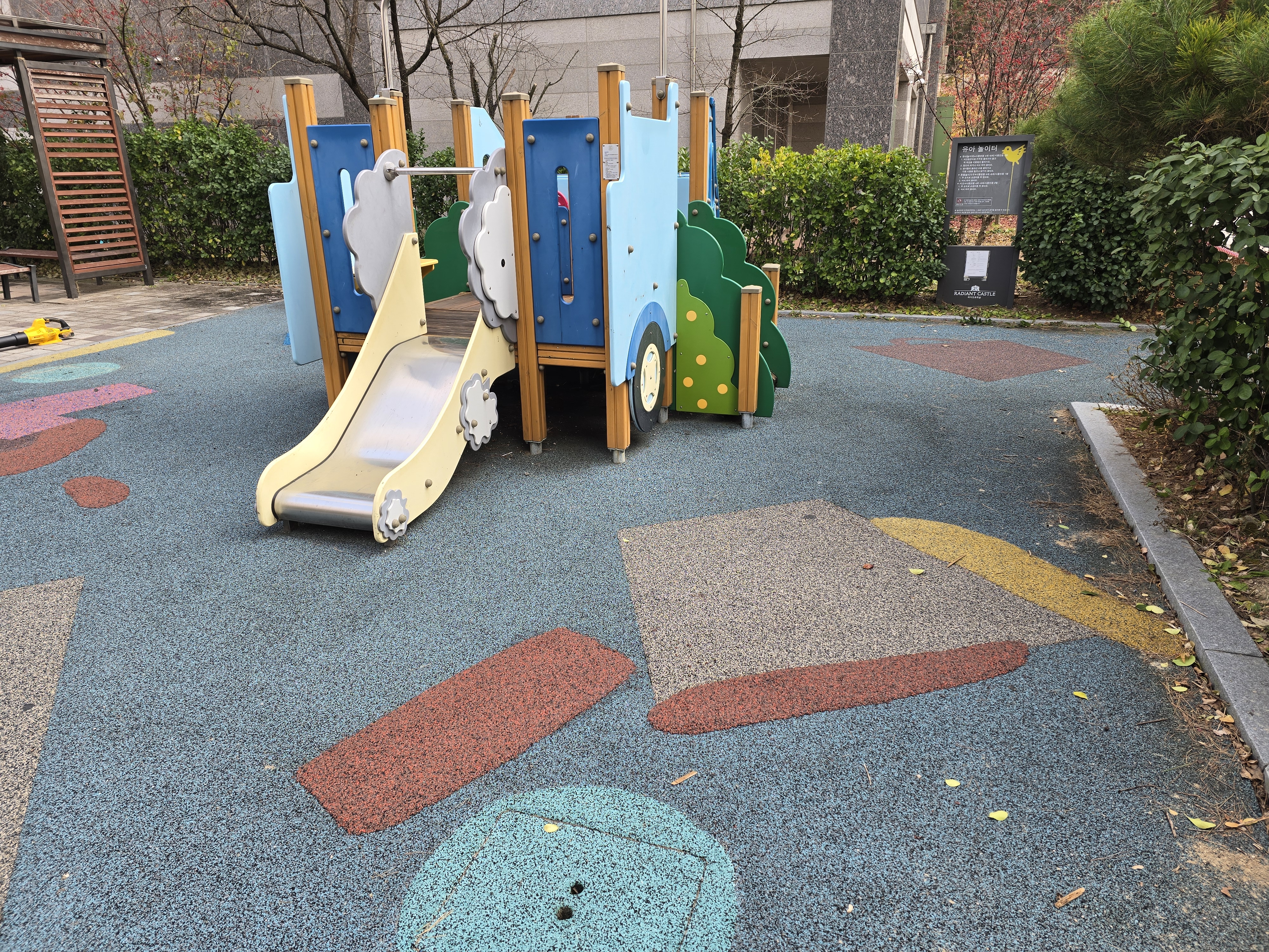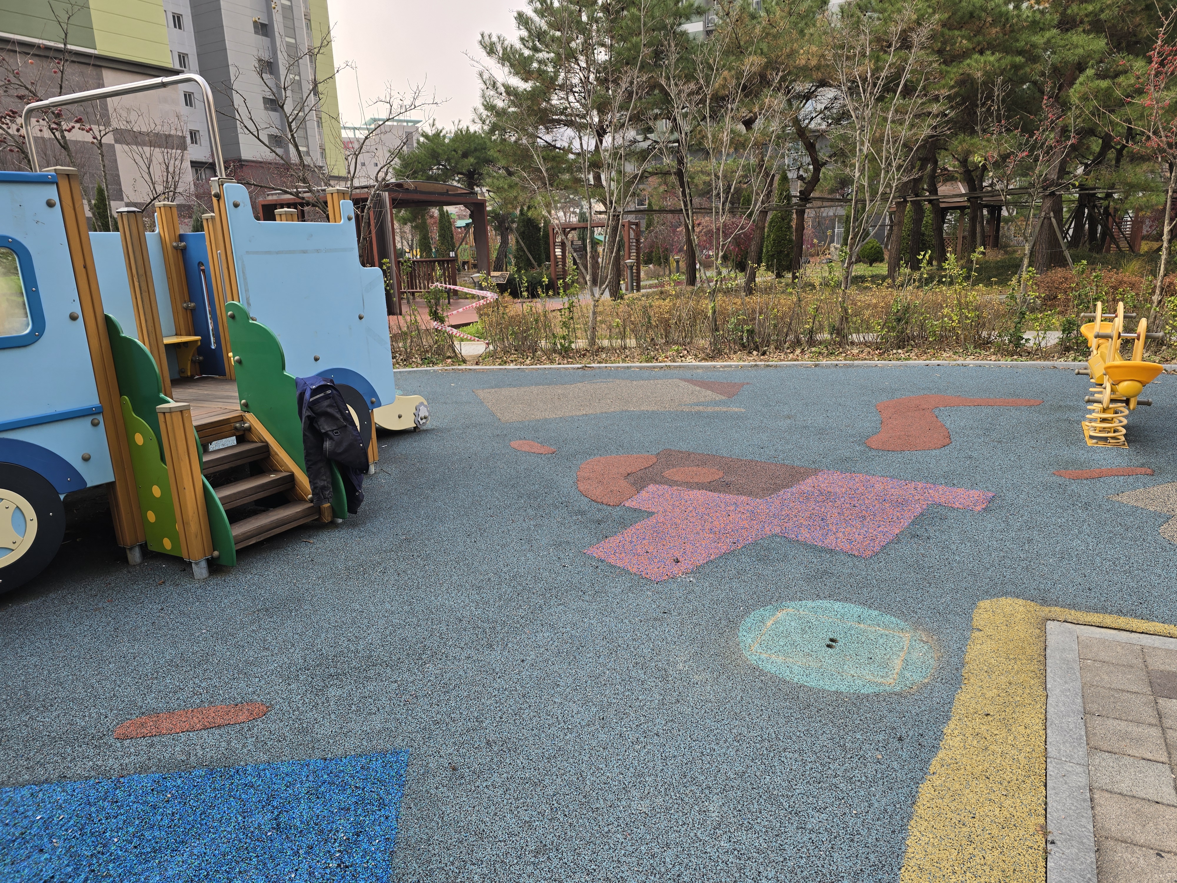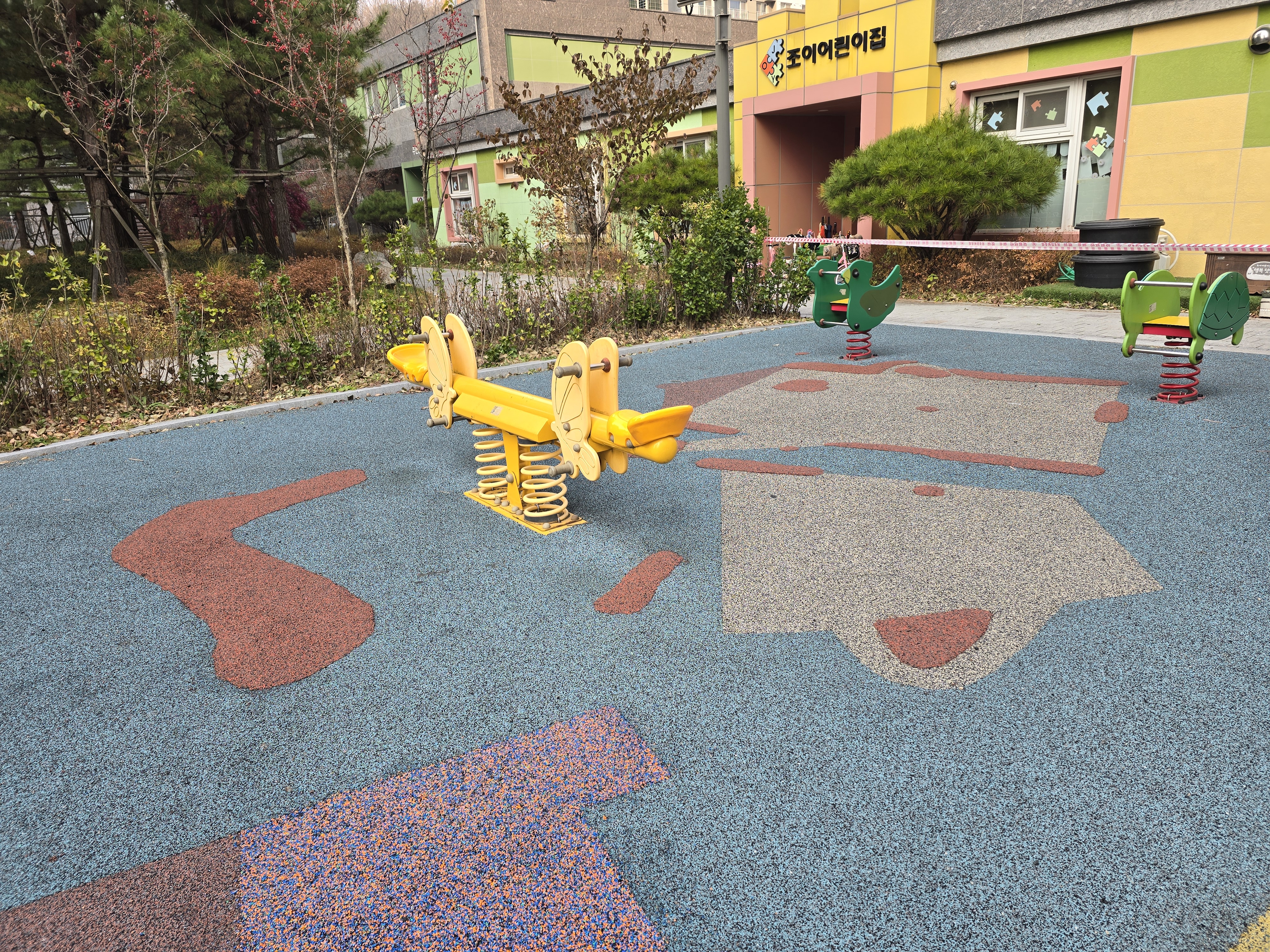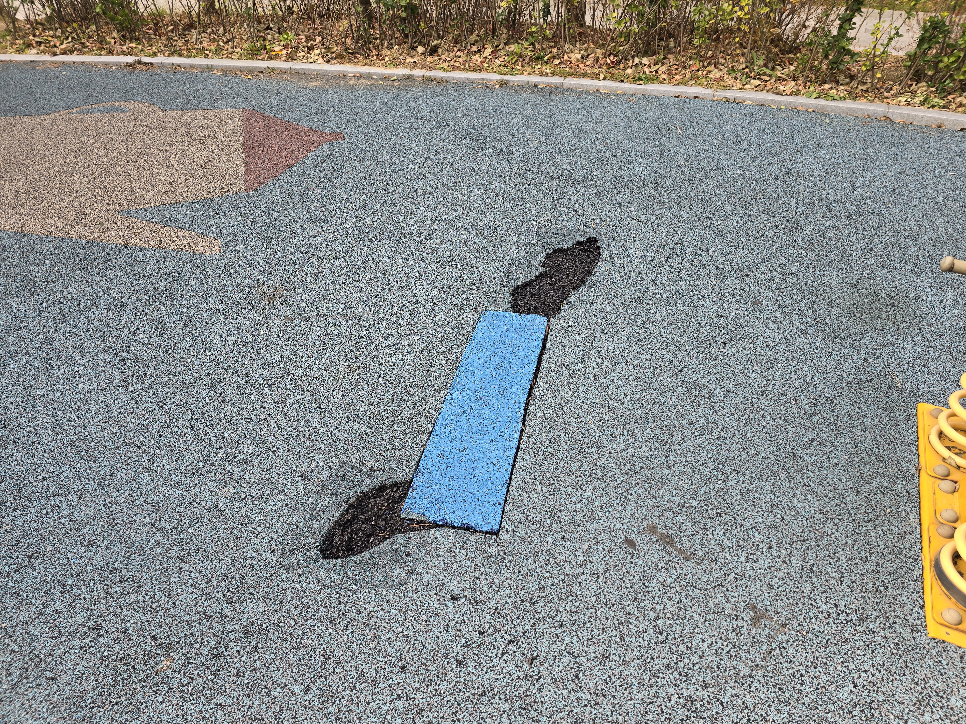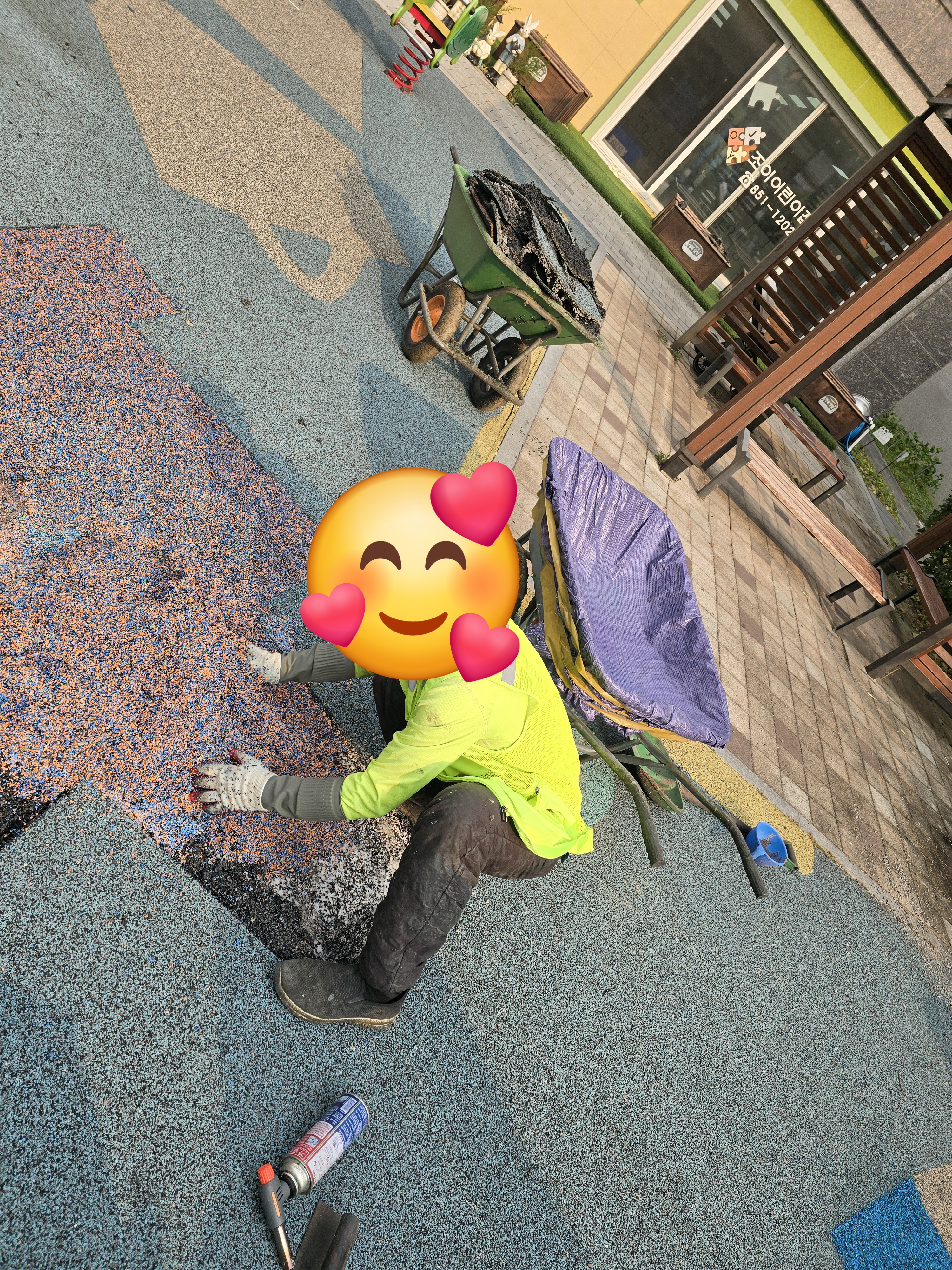 오늘은 민락동 ㅇㅇ아파트 단지내 어린이놀이터 바닥 훼손으로 인한 부분 친환경 탄성고무칩 보수 작업을 진행했습니다.